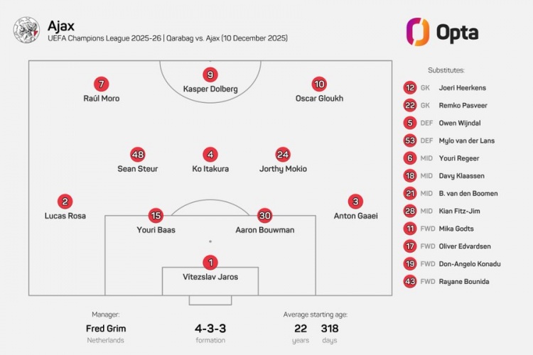 据opta数据统计,这是阿贾克斯队史首次在欧冠首发中派出两名17岁或17岁以下的球员。